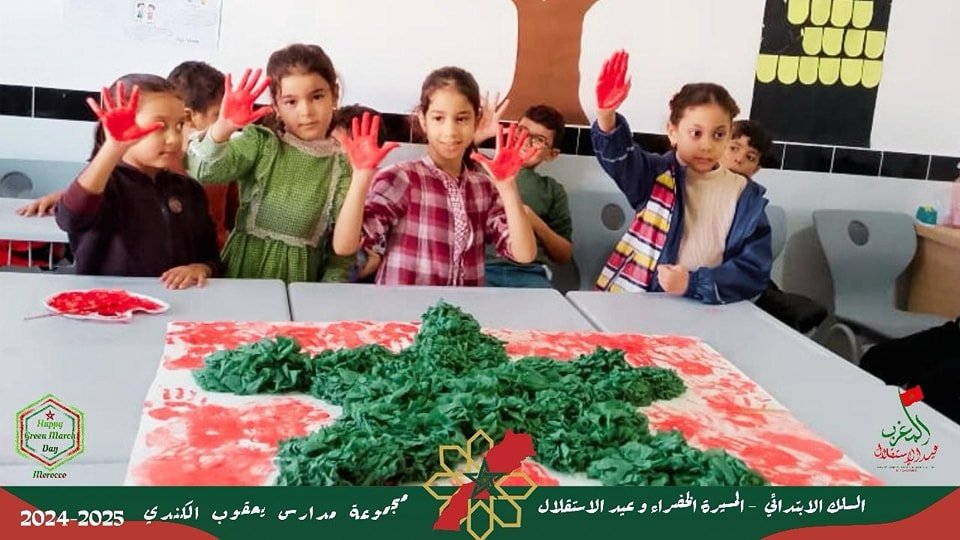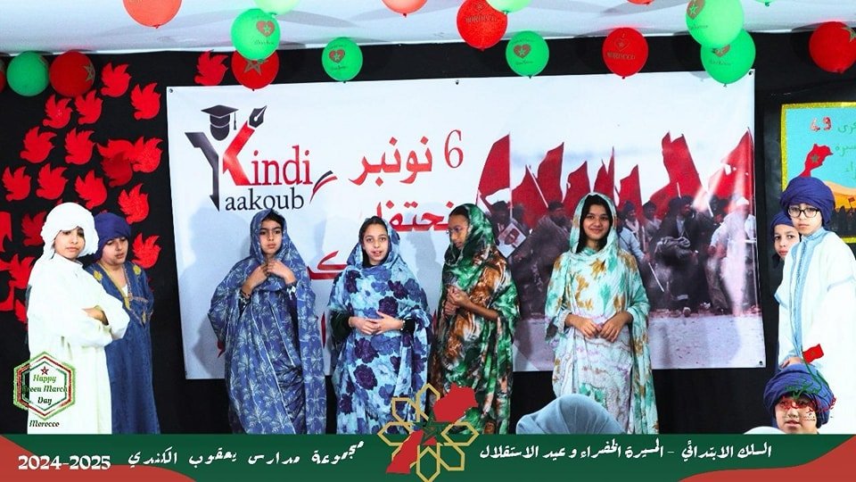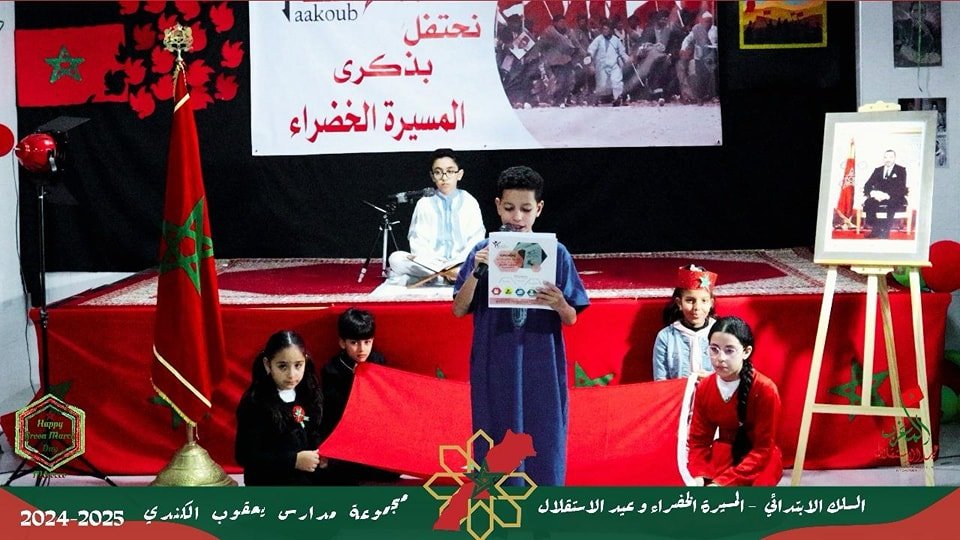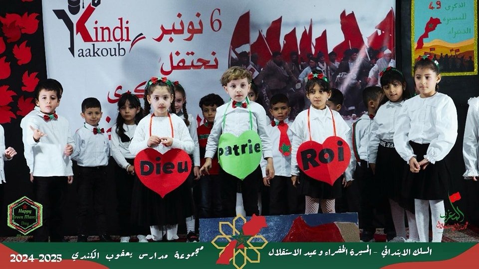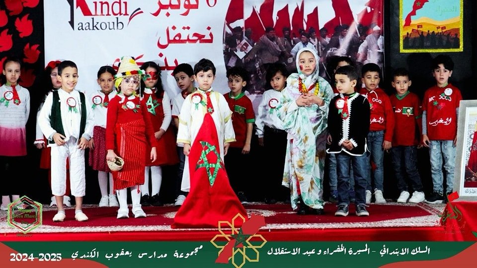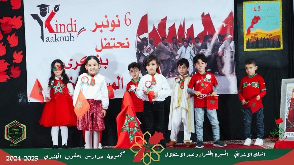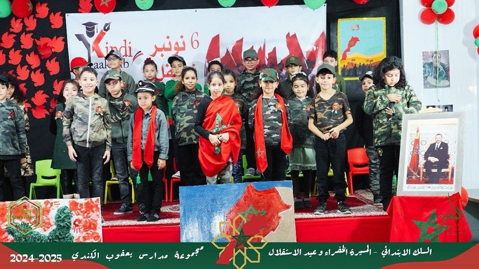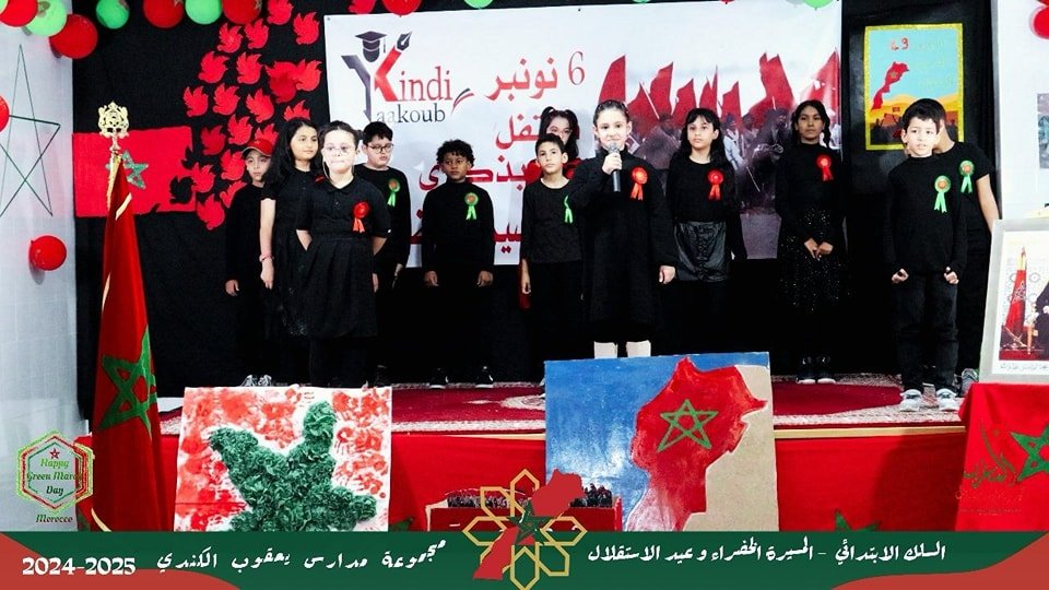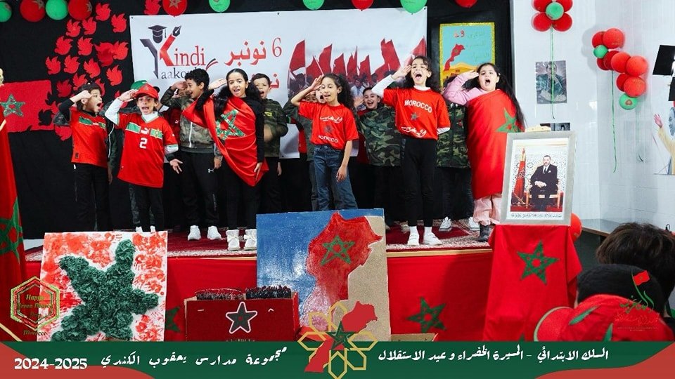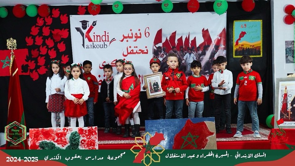 يسر مجموعة مدارس يعقوب الكندي الخاصة بمدينة طنجة أن تقدم لكم هذا المهرجان الاحتفالي الذي يُجسد أسمى قيم الوطنية والولاء. في هذا الشهر المميز، شهر نونبر، الذي يحمل في طياته العديد من الاحتفالات بانتصارات بلادنا، قمنا بالاحتفال بذكرى المسيرة الخضراء المظفرة وذكرى عيد الاستقلال. حيث أبدع تلاميذنا الصغار في تقديم لوحات تعبيرية تعكس حبهم الكبير لوطنهم ولجلالة الملك محمد السادس نصره الله.من خلال هذه اللحظات المفعمة بالمشاعر، نؤكد على أهمية التلاحم الوطني من طنجة إلى الكويرة، تحت شعار “الله، الوطن، الملك”. نتوجه بالشكر الجزيل لكل من ساهم في إنجاح هذا الحدث، من مدرسين وإداريين، على جهودهم المميزة في تعزيز روح الانتماء والفخر لدى أبنائنا